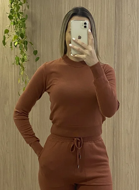 Possui gola alta discreta, mangas longas e acabamento canelado na gola, nos punhos e na barra, assegurando melhor estrutura, durabilidade e caimento uniforme. O tricô encorpado mantém a forma da peça mesmo após o uso contínuo.
