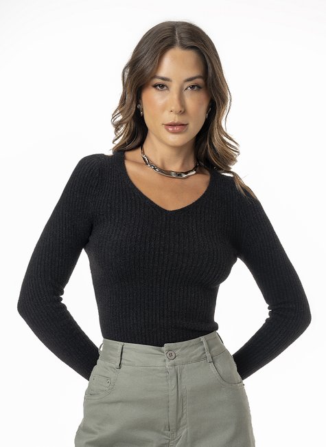 O design apresenta tricô canelado, que se adapta ao corpo com leve elasticidade e traz um visual sofisticado. O decote em V valoriza o colo e adiciona um toque feminino ao modelo, enquanto o recorte nos ombros cria um detalhe moderno que destaca o design da peça e traz personalidade ao visual.