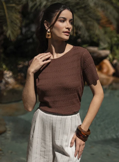 Blusa confeccionada em fio de modal, com acabamento trabalhado em mini tranças que cria um visual diferenciado e elegante, mantendo uma aparência leve e atual. O design clean permite fácil combinação com diferentes propostas de look.