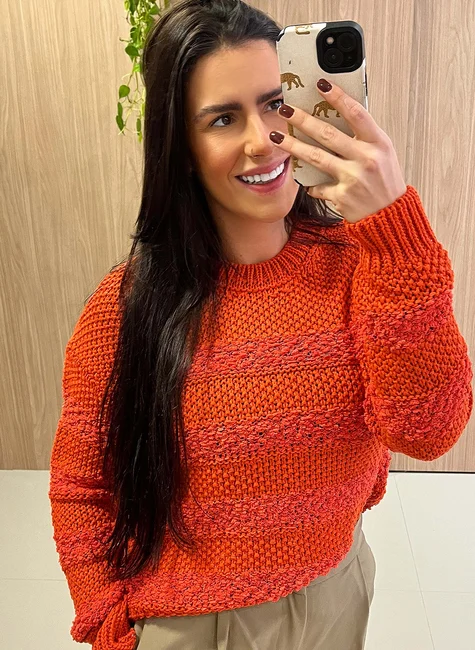 A Blusa Ellis Listrada Com Pontinho é a escolha ideal para quem busca conforto, textura e estilo em uma única peça. Seu trabalhado em pontinho cria um efeito listrado delicado e sofisticado, trazendo profundidade visual e um toque moderno ao tricô.