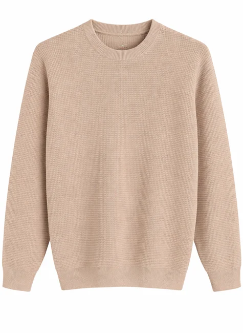 O destaque do modelo está na padronagem com listras horizontais combinadas ao efeito de pontinhos no tricô, criando um visual discreto, porém sofisticado. O decote redondo conta com acabamento canelado que proporciona melhor ajuste ao pescoço e reforça a estrutura da peça. As mangas longas possuem punhos canelados e a barra ajustada garante encaixe confortável ao corpo, mantendo o padrão de qualidade e durabilidade.