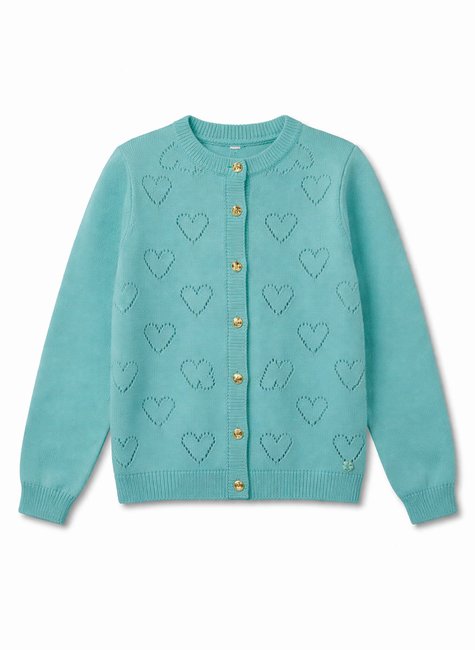 O destaque do modelo está no Trabalhado De Coração distribuído ao longo da peça, que valoriza a construção visual do tricô e acrescenta um toque lúdico e delicado ao produto. A abertura frontal por Botões amplia a funcionalidade do casaco, permitindo uso fechado ou em sobreposição, enquanto o desenho vazado reforça a proposta charmosa e comercialmente atrativa da peça.